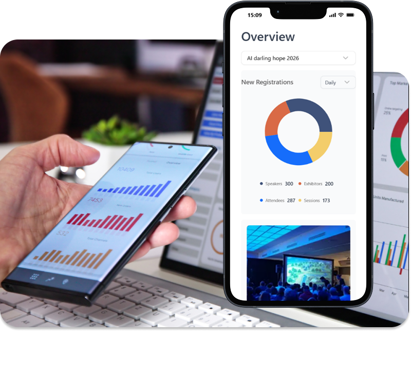 Actionable insights: session attendance, content engagement, product demo performance, meetings held, and post-event feedback. Real-time dashboards help HR, marketing, and sales teams understand what works, while exportable reports feed internal processes (e.g., commercial follow-up, training programmes, employee engagement initiatives). Faster decisions, continuous improvement, and events that grow in value over time.