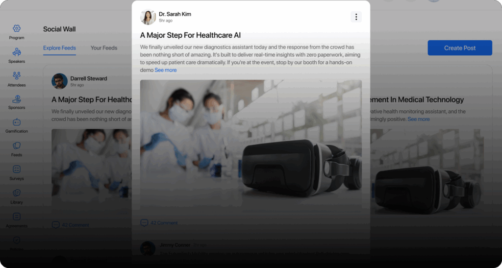 Chat, social wall, polls, Q&A, and gamification make every event participatory. From corporate meetings to conventions with thousands of attendees, participants become active contributors, not just spectators.
