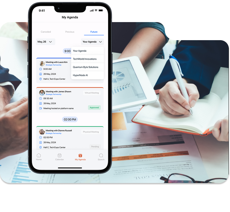 Transport, meals, and accommodation can be booked through the app. Data and preferences integrate into organisational workflows, creating new opportunities for partners and sponsors.
